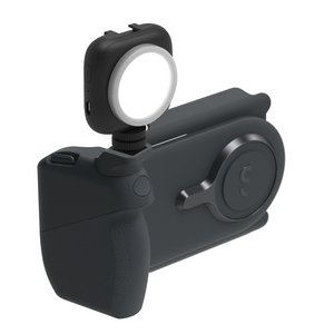 The mini light mounts on the ProGrip wonderfully and it can be reversed for selfies also, great little tool! This light is small, has three output settings and an included defuser. For selfie mode, I use low mode, and for forward camera I use high setting. It is good for things closer to the camera that could use some help with light input. After I recieve the lens my next purchase will the the bigger light that I think runs about $100. But I can shoe mount that on a tripod, great for taking portrait type shots I am hoping when I do not want to bring the whole barn to take shots on the camera.